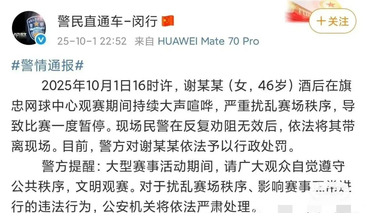 之后,警方发布通报,称谢某喝了酒去了比赛现场,严重扰乱赛场秩序,已经对她进行处罚。