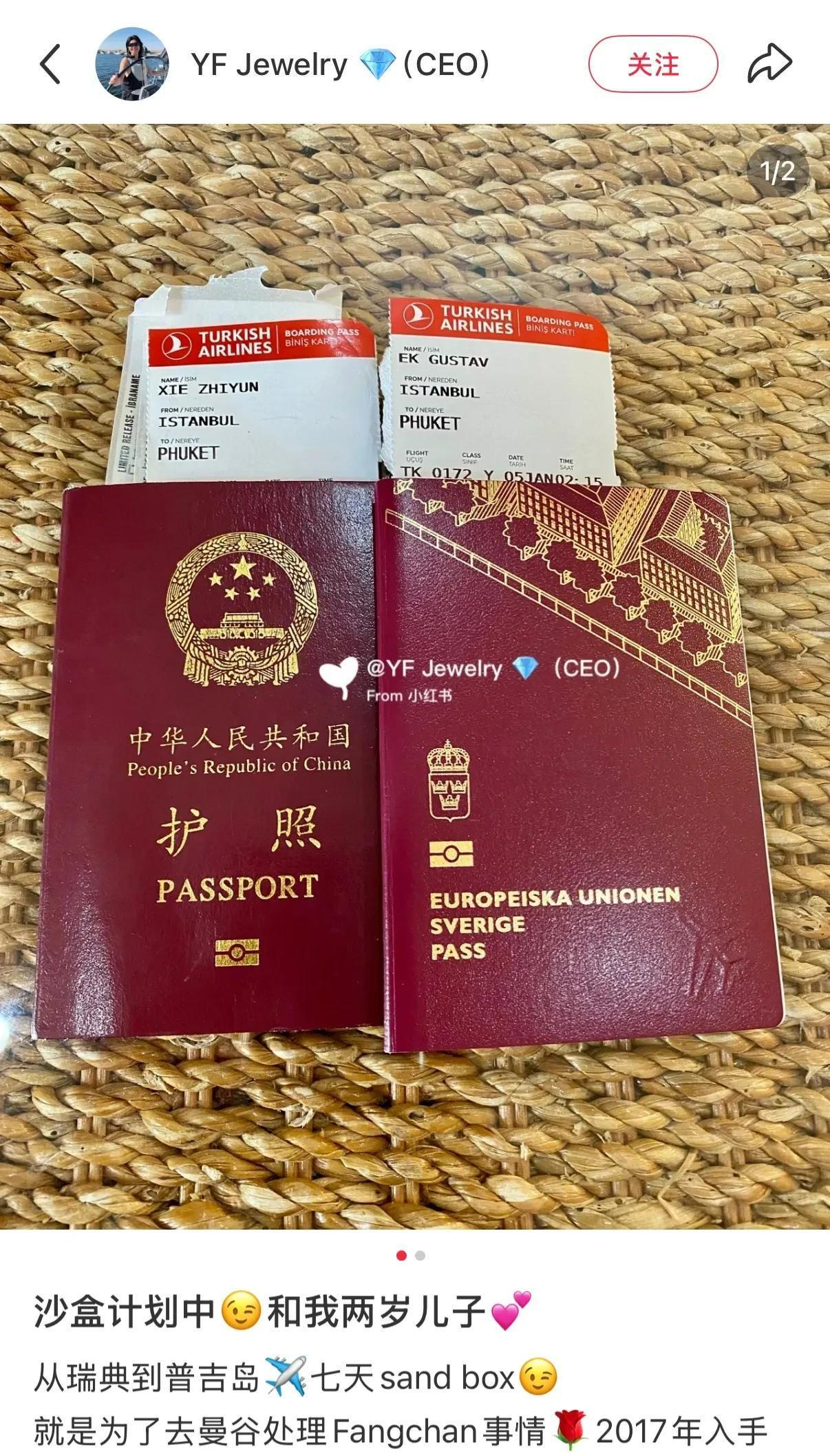 谢某的国籍也是网友关注的焦点,她在网上晒出一本瑞典护照,应该是她本人的。但也有网友认为,谢某的儿子应该是瑞典护照,她自己还没有获得,只是拿出来炫耀。