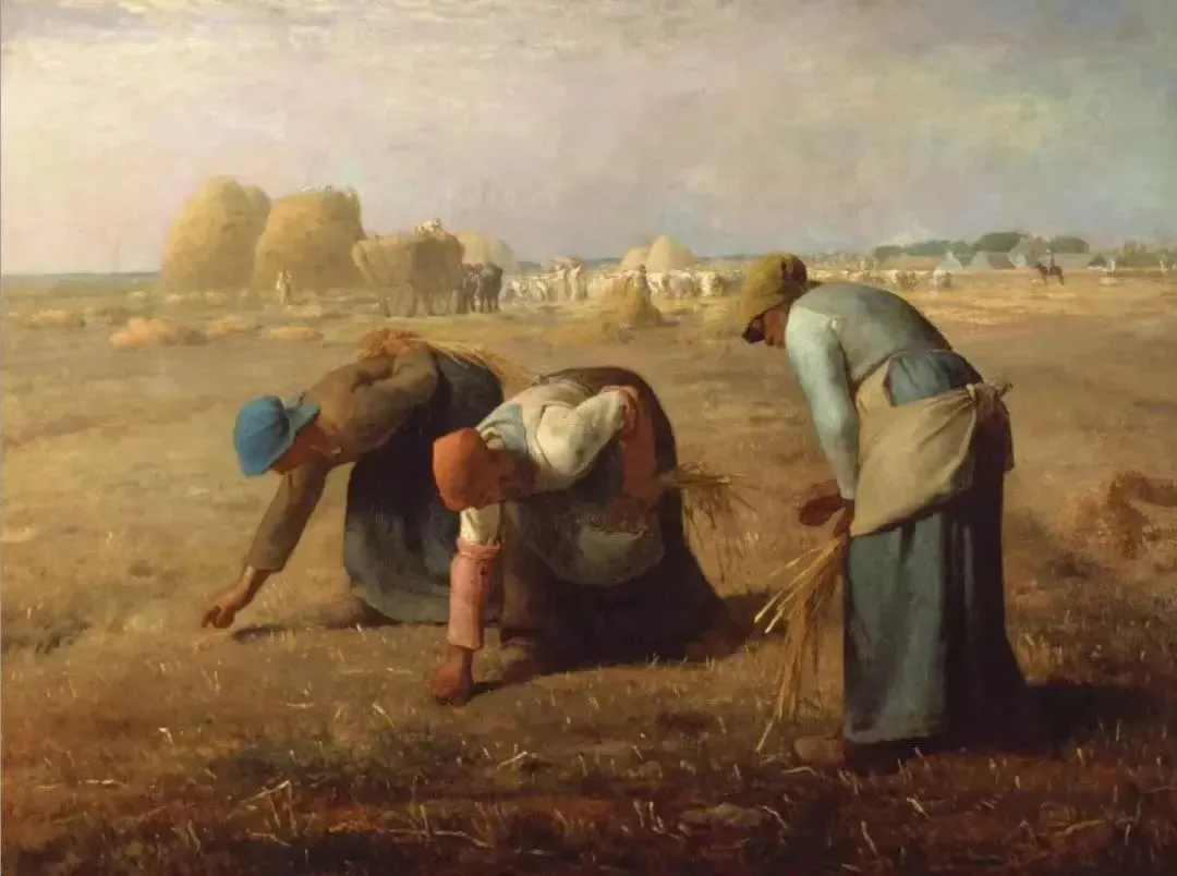 在米勒的传世名作《拾穗者》中,三位农妇在丰收后的田地里弯腰拾穗,动作疲惫却充满了专注,仿佛在进行一项庄严神圣的仪式。