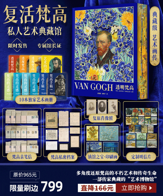 当然,如果您是想深度了解梵高的艺术灵感来源,想留存他一生的重要“周边”事件,我们更推荐您入手一个更震撼!更能够全面了解梵高的传家收藏级套餐,特价799元!
