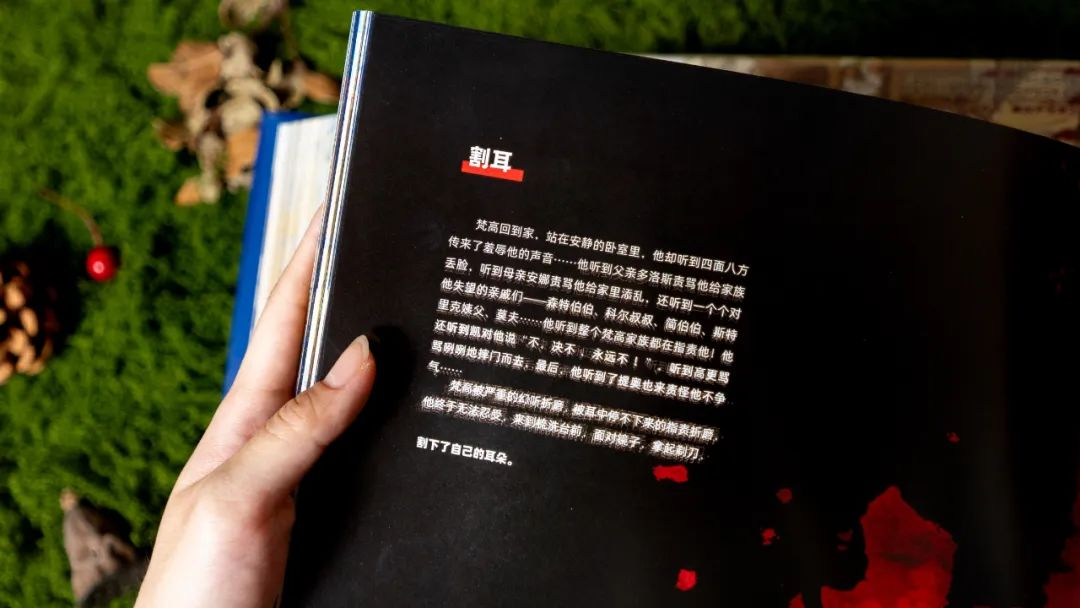 讲到“割耳”惊人一幕,还以模糊、虚化的字体,“神还原”梵高当时错乱、迷狂的精神状态。创意绝了!