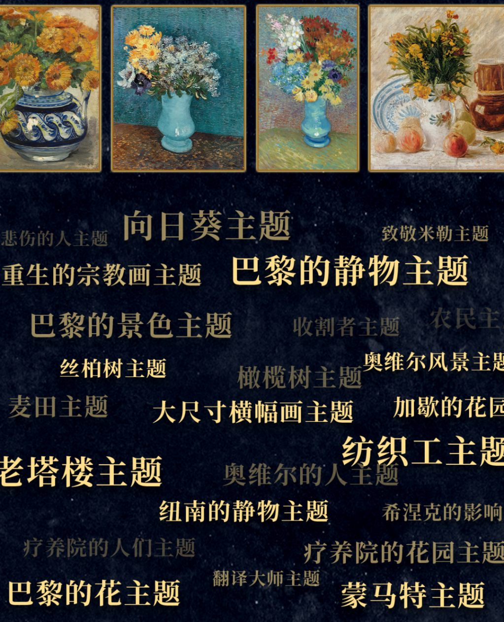 向日葵、麦田、农民、疗养院、巴黎的花、巴黎的自画像……清晰梳理梵高一生的创作脉络。