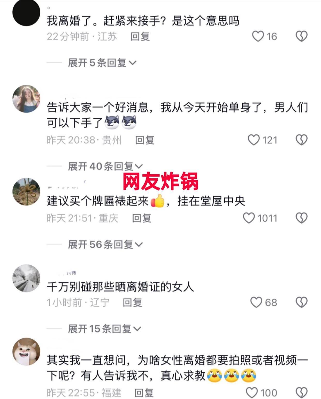事件曝光后,网友评论两极分化。有人调侃:“女人离婚爱晒证,生怕别人不知道;男人离婚却低调,高下立现。”也有人直言:“她根本不会过日子,以前有老公养着不知柴米油盐贵,现在没人管了原形毕露。”
