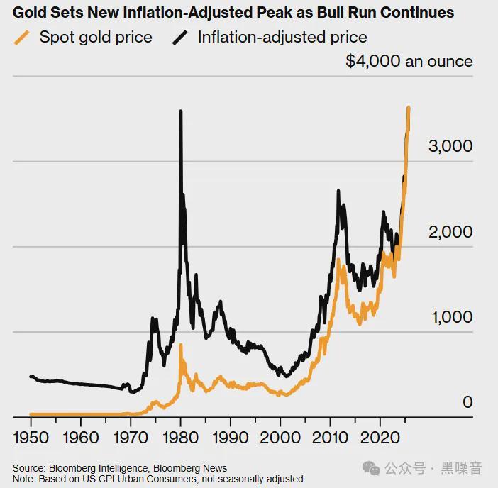 尤为引人注目的是,此次金价突破了45年前经通胀调整后的历史峰值。1980年1月21日,金价曾达到850美元/盎司的高点,按消费者价格指数折算,这一价格相当于现在的约3590美元/盎司。这意味着,整整45年的通胀折算金价纪录,在2025年被彻底打破,金价之疯狂可见一斑。