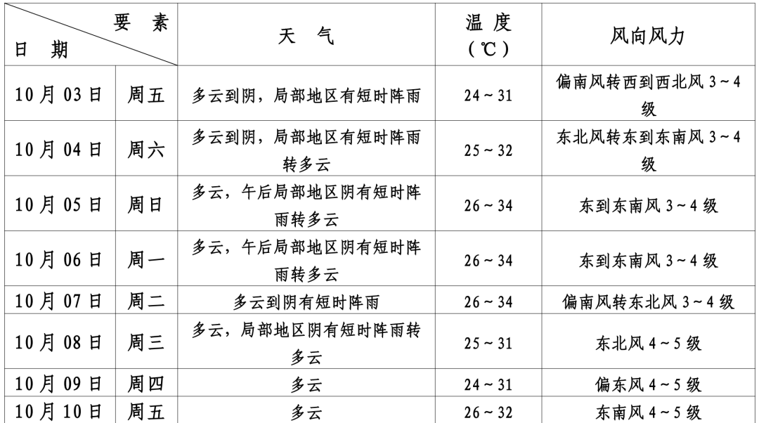 据最新气象资料分析:国庆假期期间,本区将处于副热带高压边缘地带,天气以多云为主,局部地区可能会出现短时阵雨。气温方面,将呈现先升后降的趋势,预计在10月5日至7日期间,最高气温将达到34℃左右。而到了8日至9日,受弱冷空气的影响,最高气温将略有下降。