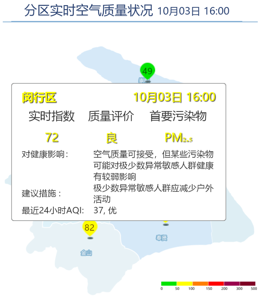 截至10月3日16时,闵行区的AQI指数为72,属于良好水平。而昨天的AQI指数为37,达到了优级标准。根据上海市环境监测中心的预报,今天夜间空气质量将保持良好,明天上午和下午也将维持良好水平,夜间则可能达到优至良的水平,后天空气质量同样良好。