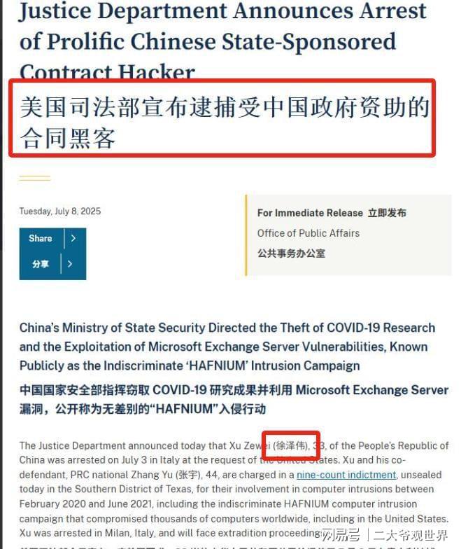 2025年7月初,中国工程师徐泽伟刚抵达米兰马尔彭萨机场,便被意大利警方逮捕。美国指控他参与“中国支持的黑客活动”,并要求引渡受审。这一事件毫无征兆,徐泽伟仅因一次模糊的邮箱登录记录,便被扣上“中国支持的黑客组织”的帽子。