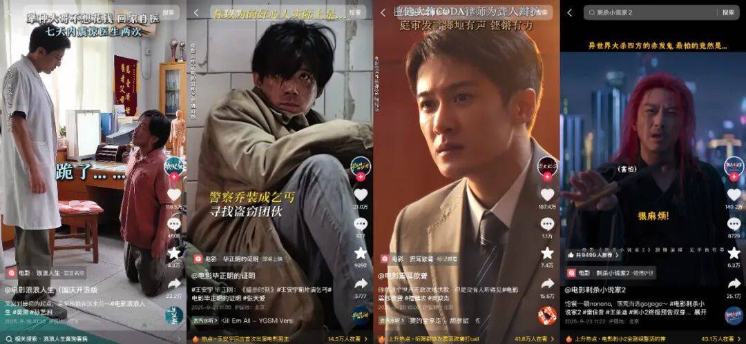 短视频平台仍是年轻观众获取电影信息的主要渠道,但片方对短视频营销的运用已回归理性。国庆档影片在差异化传播上各有侧重:《浪浪人生》强化合家欢喜剧氛围,《毕正明的证明》营造奇观感与反扒题材新鲜感,《震耳欲聋》借主演檀健次人气深挖现实话题,《刺杀小说家2》则主打明星阵容与头部制作。短视频成为宣发的"前哨战",但已非"决胜局"。