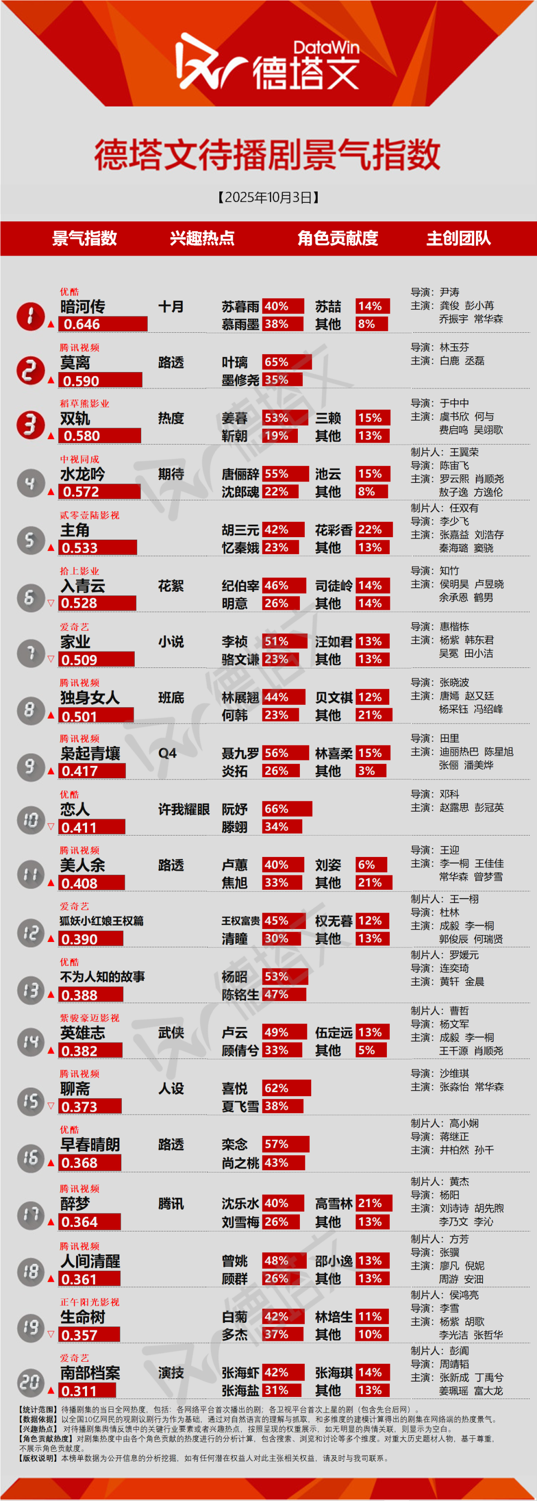 许我耀眼(许妍52% 沈皓明31%) 一笑随歌(凤随歌40% 付一笑40%) 沉默的荣耀(吴石42% 朱枫22%) 芬芳喜事 绝命法官 守护者们 围猎 吴邪私家笔记 阵地 欢乐家长群2