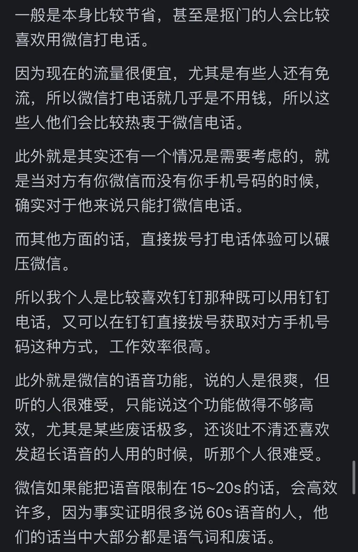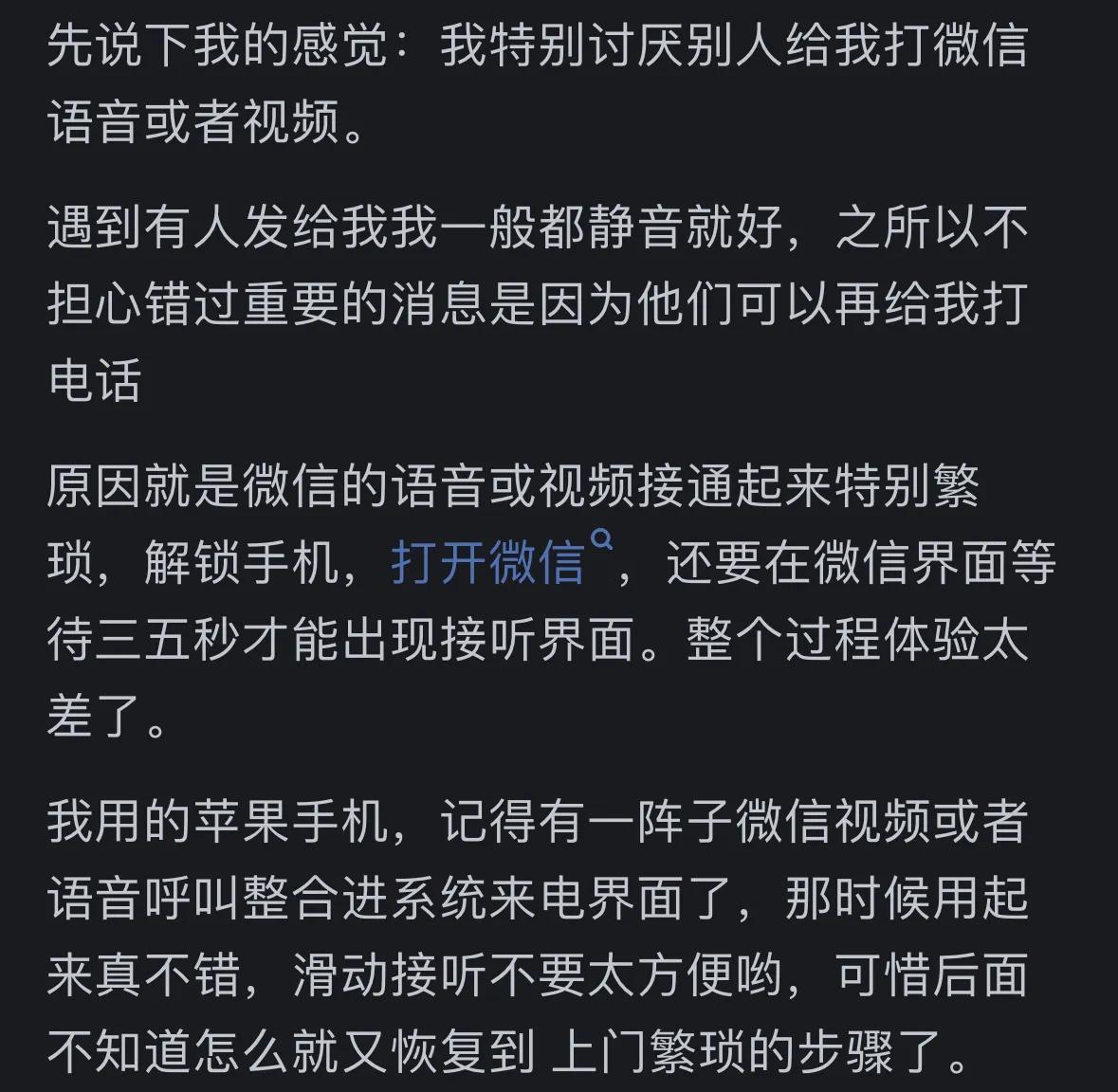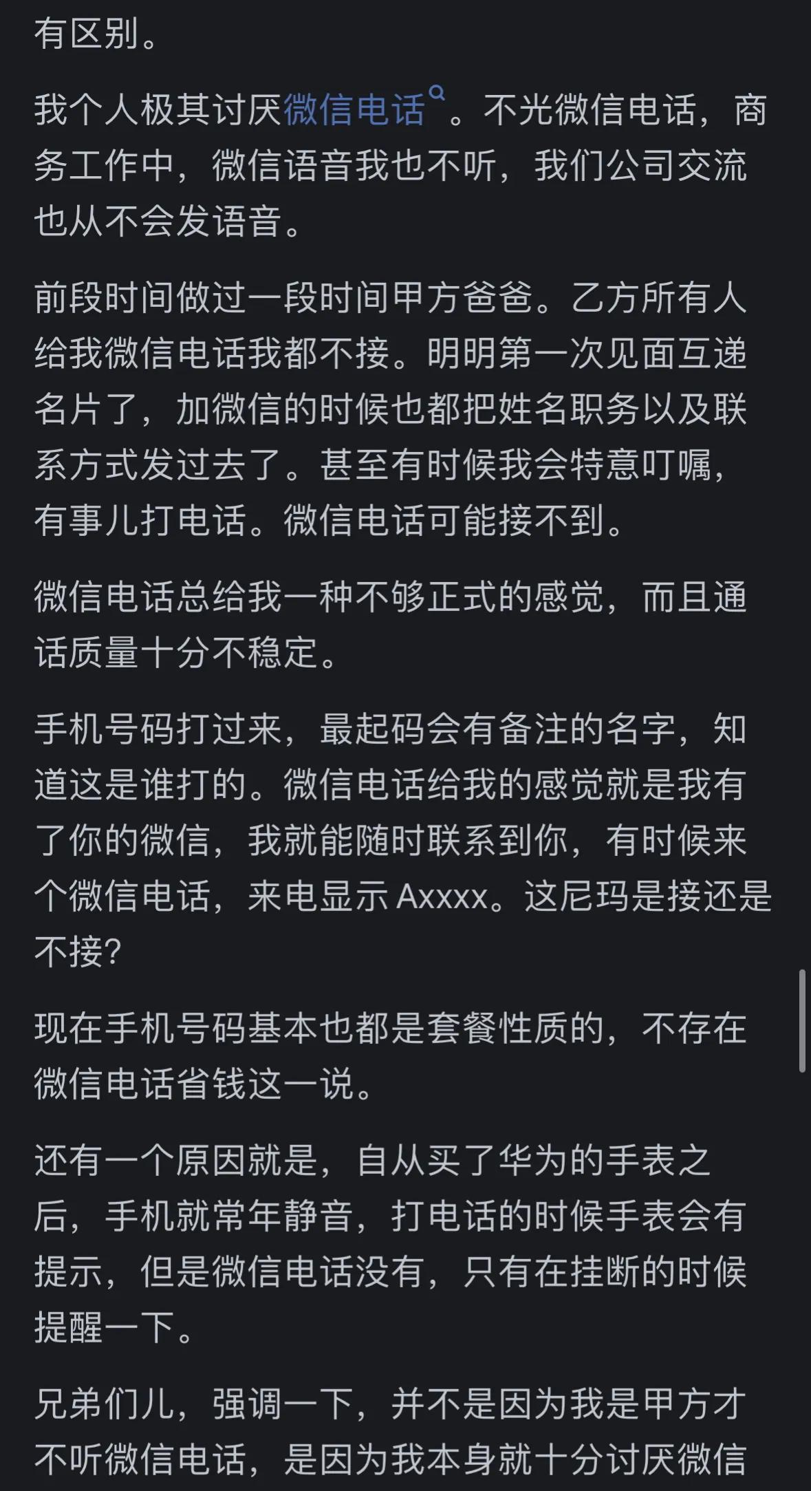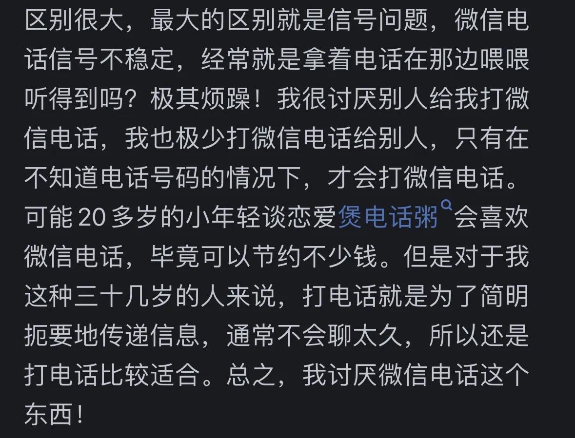 有网友表示,自己非常反感微信通话。一方面,网络信号不好时,微信通话经常会断线;另一方面,微信通话给人一种突兀感,不够正式。因此,在工作交流中,他们更倾向于直接打电话或发微信文字。