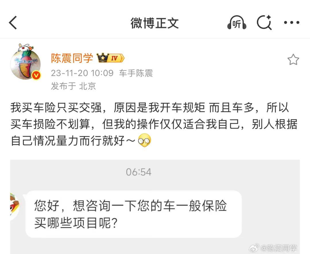 值得一提的是,陈震在2023年曾表示自己只购买交强险,不买车损险。他解释称:“我买车险只买交强,原因是我开车规矩,而且车多,所以买车损险不划算。但我的操作仅仅适合我自己,别人根据自己情况量力而行就好。”这一言论在当时也引发了不小的争议。