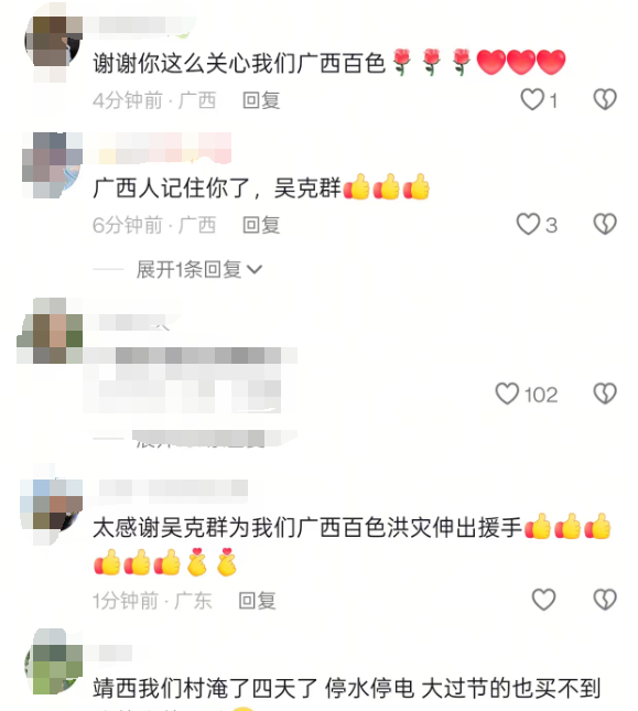 当天,知名艺人@吴克群 在社交媒体上发布了一段视频,为广西百色加油打气。他在视频中深情配文:“希望百色早日渡过难关,百色人民平平安安,百色加油!”更令人感动的是,吴克群还宣布将捐出10万元,用于帮助百色灾区的人民。
