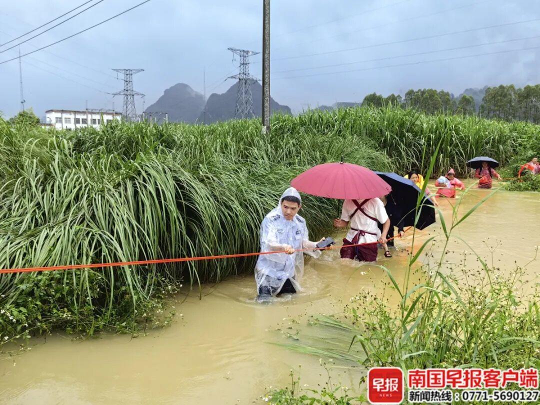 ▲德保民警紧抓牵引绳,带领10余名被困者向安全区域转移。