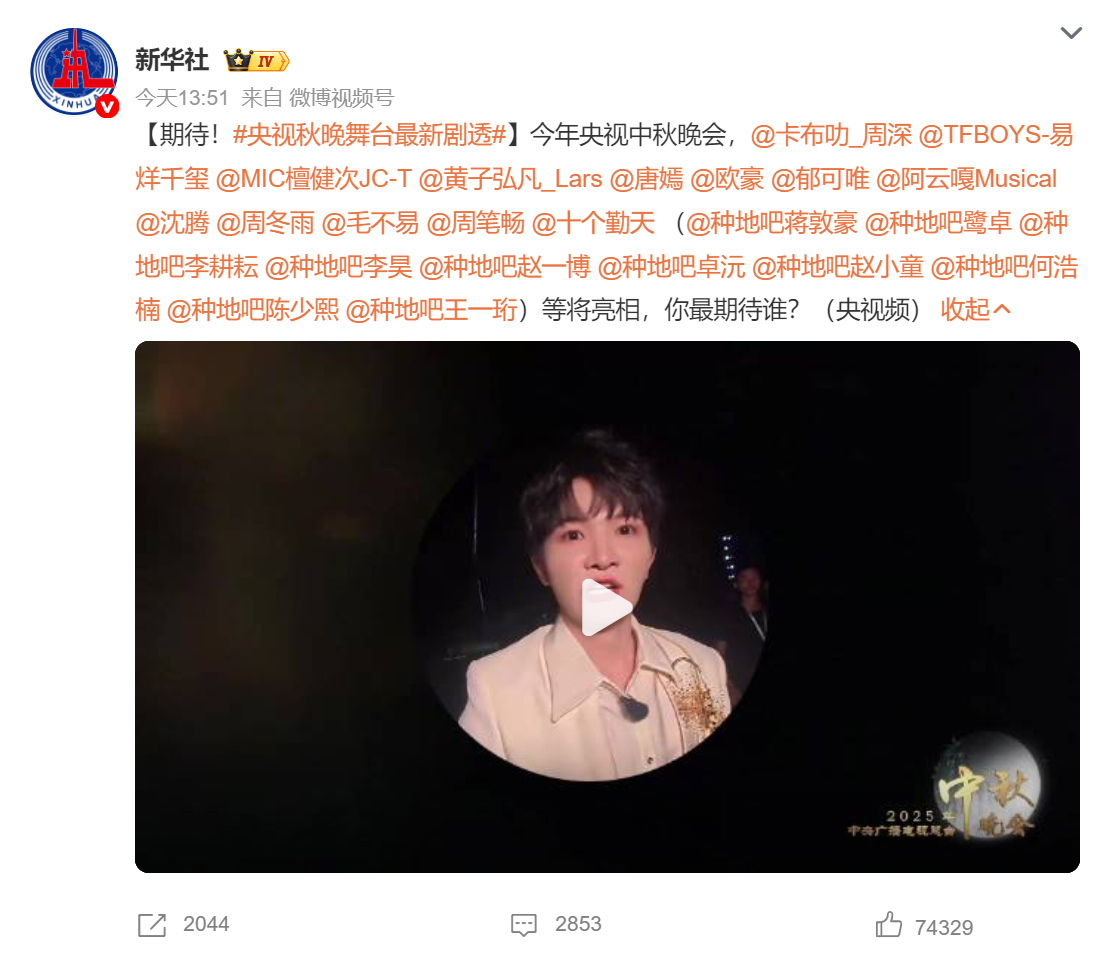 在央视秋晚的阵容中,周深的名字格外亮眼。他不仅是央视舞台的“常客”,更以“四台五曲”的超强配置横扫今年中秋档,从河南卫视的潮流演绎到湖南卫视的生日首秀,成为覆盖全年龄段的“声音桥梁”。