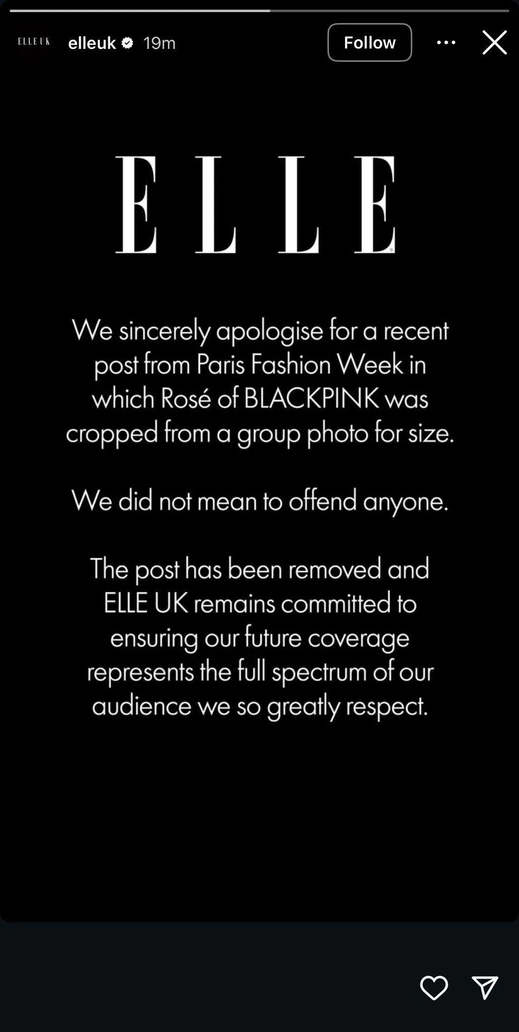 在道歉声明中,《ELLE》英国版表示:我们为最近在巴黎时装周上发布的一篇帖子诚挚道歉,在该帖子中,BLACKPINK的Rosé在合照中被裁剪掉,以调整图片尺寸。我们无意冒犯任何人。该帖子已被删除,《ELLE》英国版仍会致力于确保我们今后的报道能代表我们所尊重的读者的全貌。