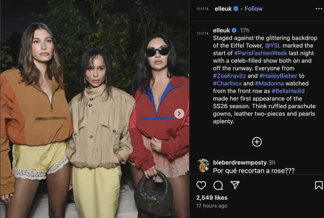 事情的起因是,《ELLE》英国版此前在社交媒体上发布了一张圣罗兰Saint Laurent 2026春夏秀前排的合影。令人意外的是,作为圣罗兰 Saint Laurent 品牌全球大使的朴彩英 Rosé 竟在这张照片中被“截掉”。这一举动瞬间引发了朴彩英粉丝的强烈不满,他们纷纷指责《ELLE》英国版的行为,甚至提出了网暴指控。