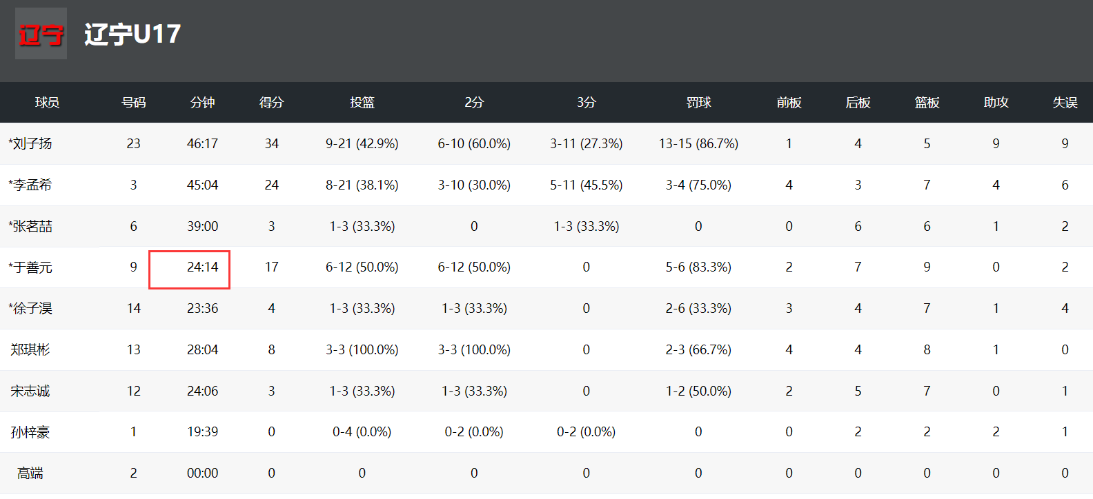 而于善元,这位年仅17岁的超新星,虽然仅登场24分钟,却高效地12投6中,拿到17分9篮板1抢断1盖帽,仅有2次失误,命中率高达50%。值得注意的是,于善元在上半场打满了20分钟,但第三节仅出战4分钟后便被换下,此后未再登场。