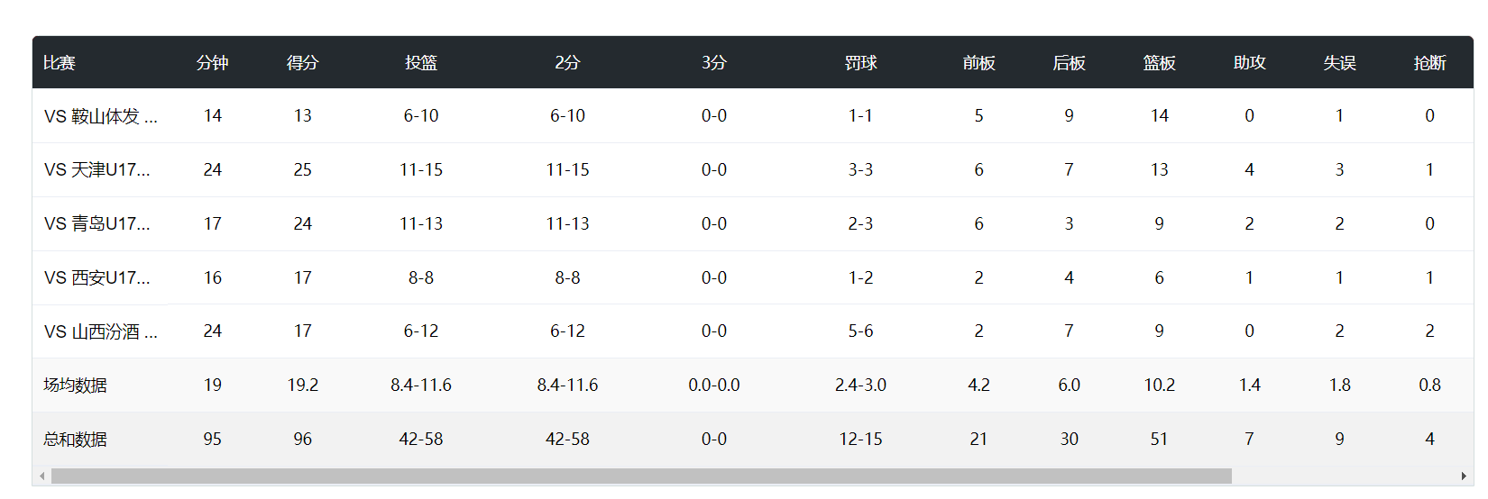 从数据上看,于善元登场的比赛只有两场达到24分钟,其余场次均不足20分钟。但即便如此,他场均仍能贡献19.2分10.2篮板1.4助攻0.8抢断1.4盖帽,命中率高达72.4%,罚球命中率也有80%。除了三分投射稍显欠缺外,他在进攻端几乎没有什么软肋。