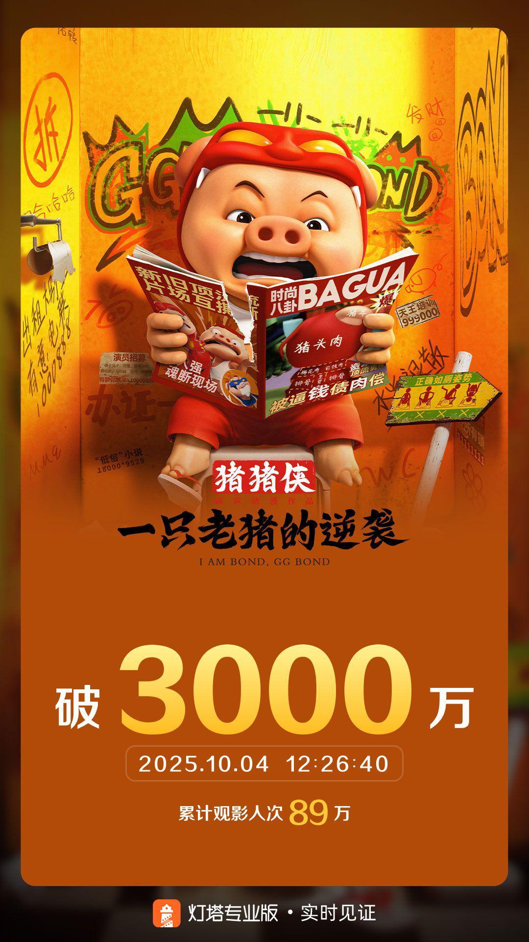 根据灯塔专业版最新实时数据统计,截至10月4日12时26分,备受关注的动画电影《猪猪侠·一只老猪的逆袭》票房正式突破3000万元大关,再次展现了国产动画电影的强大市场号召力。