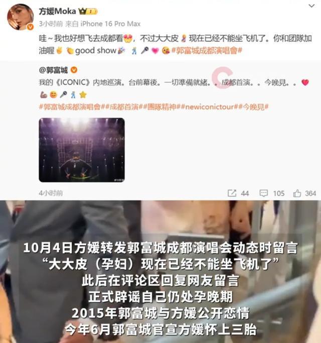 10月4日,知名艺人方媛在社交媒体上转发郭富城成都演唱会的动态时,留言透露了自己当前的状况:“大大皮(孕妇)现在已经不能坐飞机了。”这一留言迅速引发了网友们的关注和热议。随后,方媛在评论区回复网友留言,正式辟谣了此前关于她三胎已产的传闻,明确表示自己仍处在孕晚期。