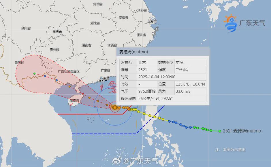 据@广东天气,今天(4日)中午12时,今年第21号台风“麦德姆”(台风级)的中心位于距离广东省湛江市徐闻县东偏南方向约640公里的南海海面上,中心附近最大风力12级,达到33米每秒的风速,中心最低气压975百帕,八级大风范围半径约240公里。