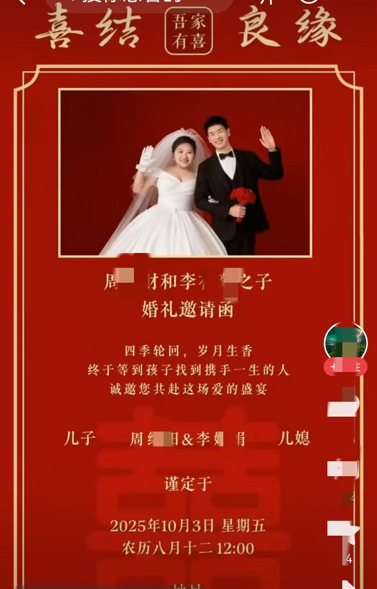 周某阳对这场婚礼极为重视,早在半月前,他就在朋友圈发布了婚礼邀请函,满怀期待地邀请亲朋好友在10月3日齐聚酒店,共同见证他们的幸福时刻。他深情地写道:“蓄谋已久,如我所愿,四季有你!”
