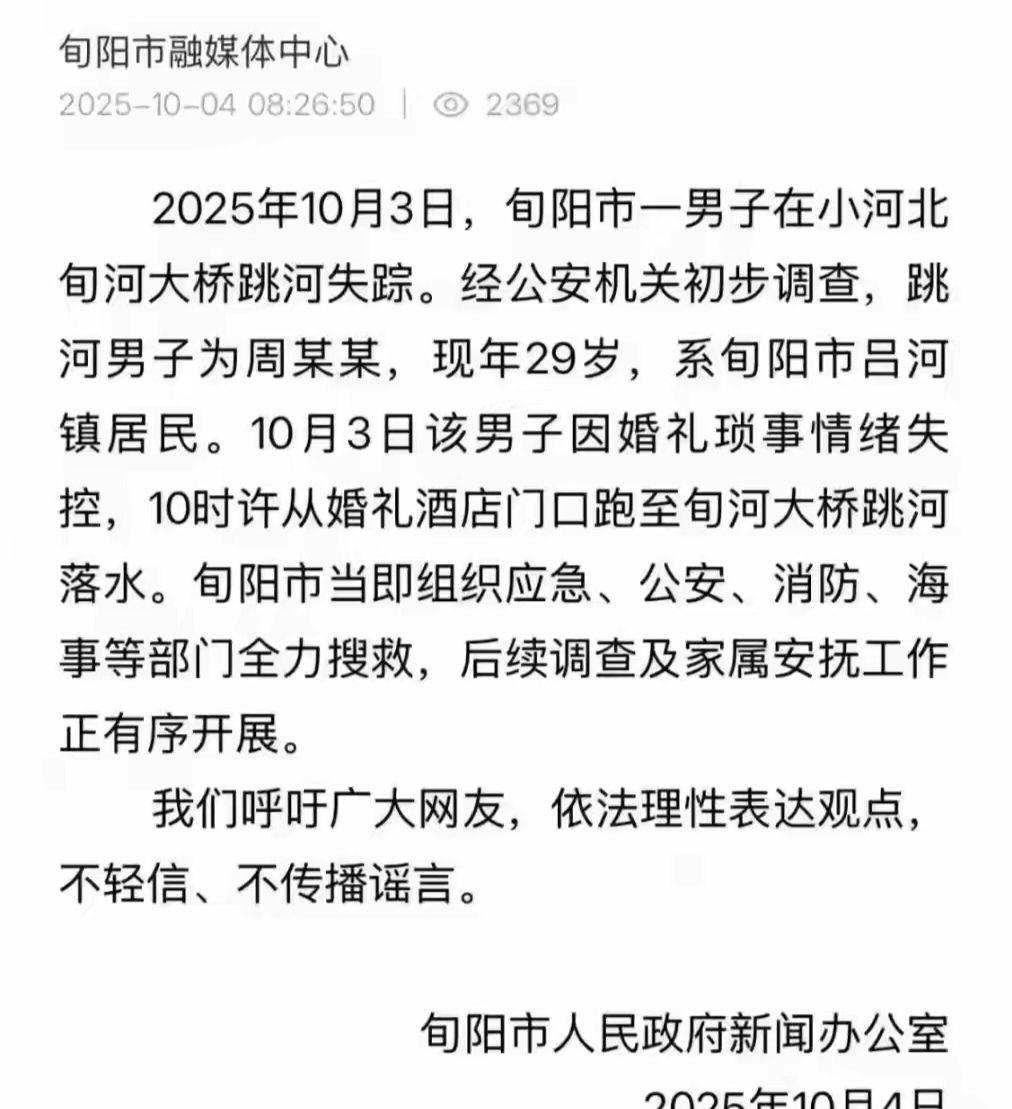 10月4日上午,当地融媒体发布通报称,周某某,男,29岁,因婚礼琐事情绪失控,于10月3日10时许从酒店门口跑到旬河大桥跳河落水,至今未找到。