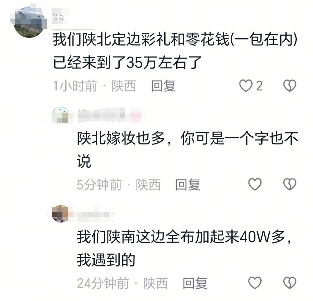 有陕西当地网友表示,他们那边的彩礼确实很高,有的地方彩礼高达35万,甚至更贵的地方达到40万。加上买房买车,结一个婚至少要150万,农村人为了结婚甚至不得不贷款。