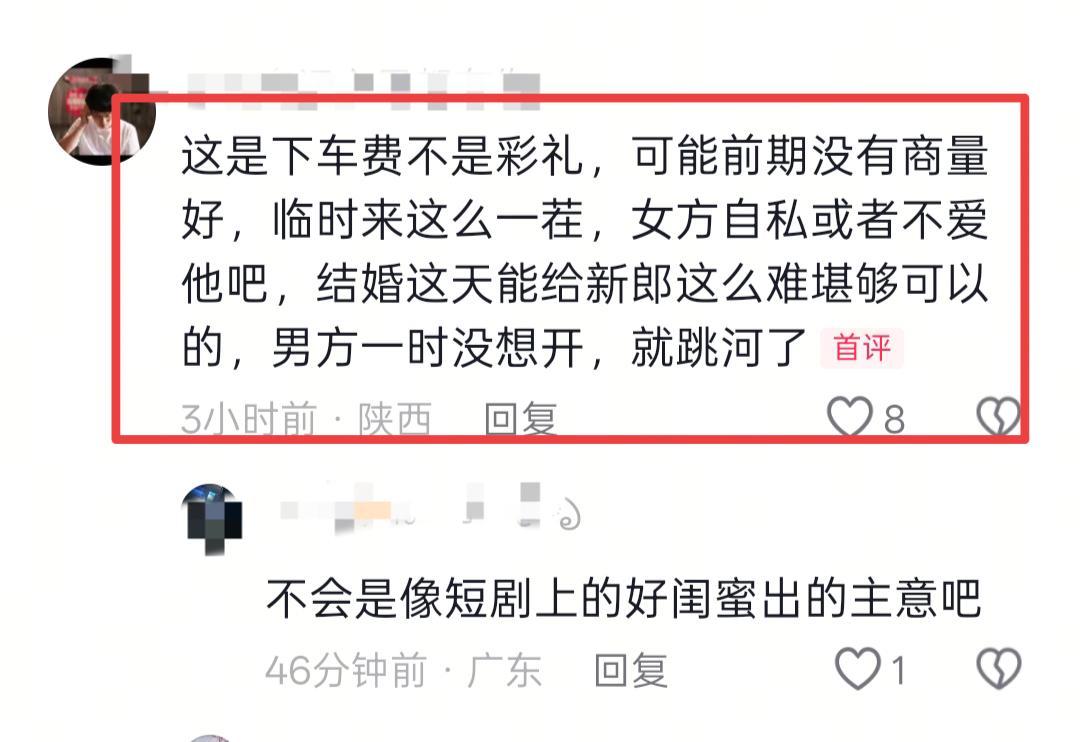 事件发生后,网络上关于新郎跳河原因的猜测甚嚣尘上。有传言称,男方婚前已支付20多万彩礼,婚礼当天女方突然要求再加2万下车费,导致新郎情绪崩溃。也有网友爆料,新郎是西安某高校教师,父母为他在工作地买房耗尽积蓄。