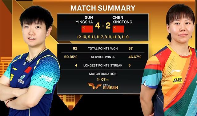 在WTT中国大满贯赛事的首场半决赛中,一场精彩绝伦的对决吸引了无数球迷的目光。最终,孙颖莎以4-2的比分战胜了陈幸同,六局比分分别为12-10、9-11、11-7、8-11、11-9、11-8,展现了两位选手的卓越实力。
