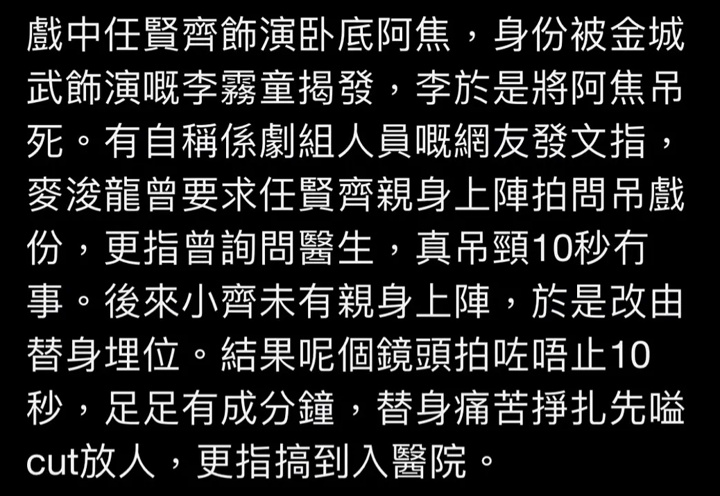 据港媒爆料,导演麦浚龙在拍摄过程中竟让替身演员吊颈长达一分钟,这一行为引发了广泛争议。