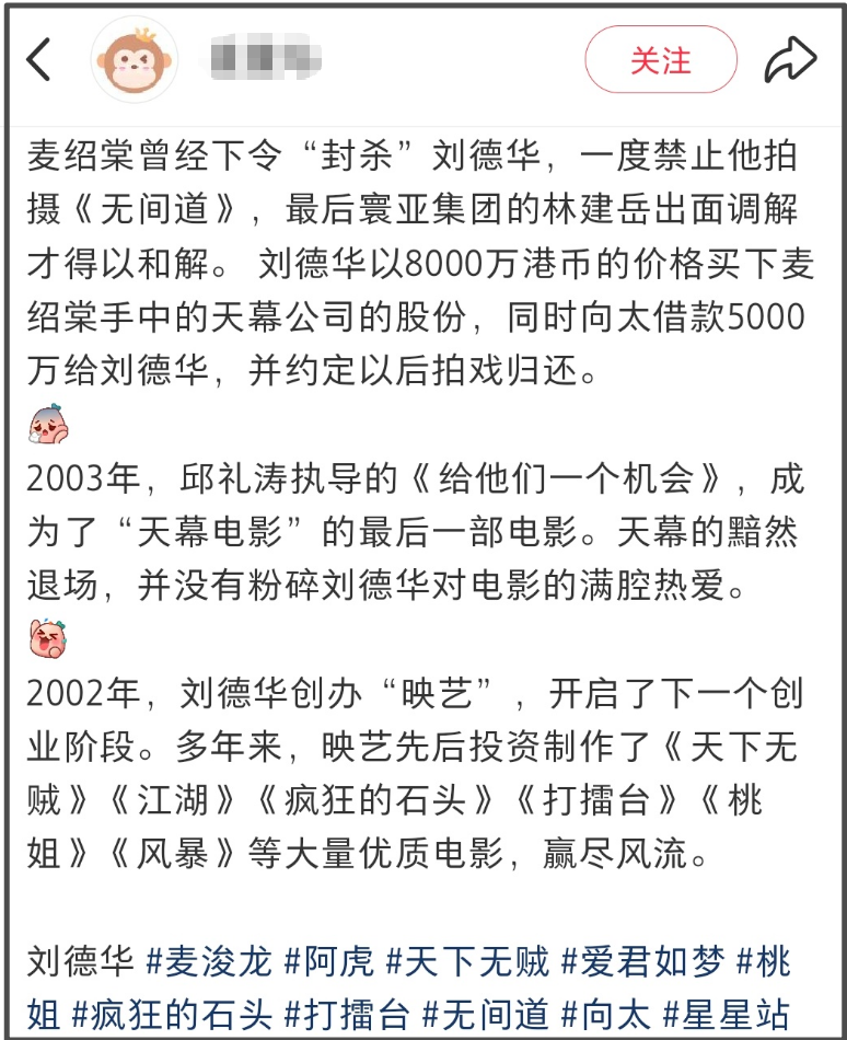 此外,还有刘德华的粉丝站出来回忆往事,表示麦浚龙的父亲曾封杀过刘德华,导致刘德华差点无法出演《无间道》。