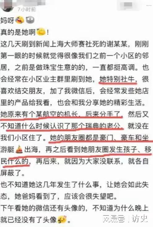 将顶级赛事变个人撒野舞台的她,引起全网众怒,网友纷纷下场谴责其丑态,邻居发声爆料,谢某的“豪门底裤”被扒,生活优越,前男友和老公背景不简单,难怪这么嚣张!