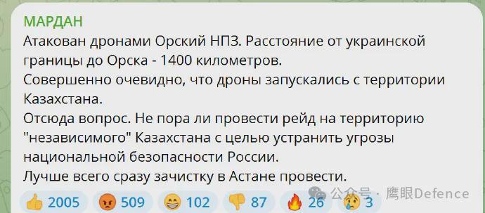 俄罗斯防空网的表现令人质疑。尽管克里姆林宫假装什么也没发生,将一系列爆炸、火灾归咎于“事故”和被击落无人机的“碎片”,但一些俄罗斯宣传员难以忍受,无能狂怒。诸如著名的马尔丹将奥尔斯克炼油厂遭袭归咎于哈萨克斯坦,称哈萨克斯坦发射无人机攻击了奥尔斯克炼油厂,并呼吁对哈萨克斯坦首都阿斯塔纳进行“清理”。
