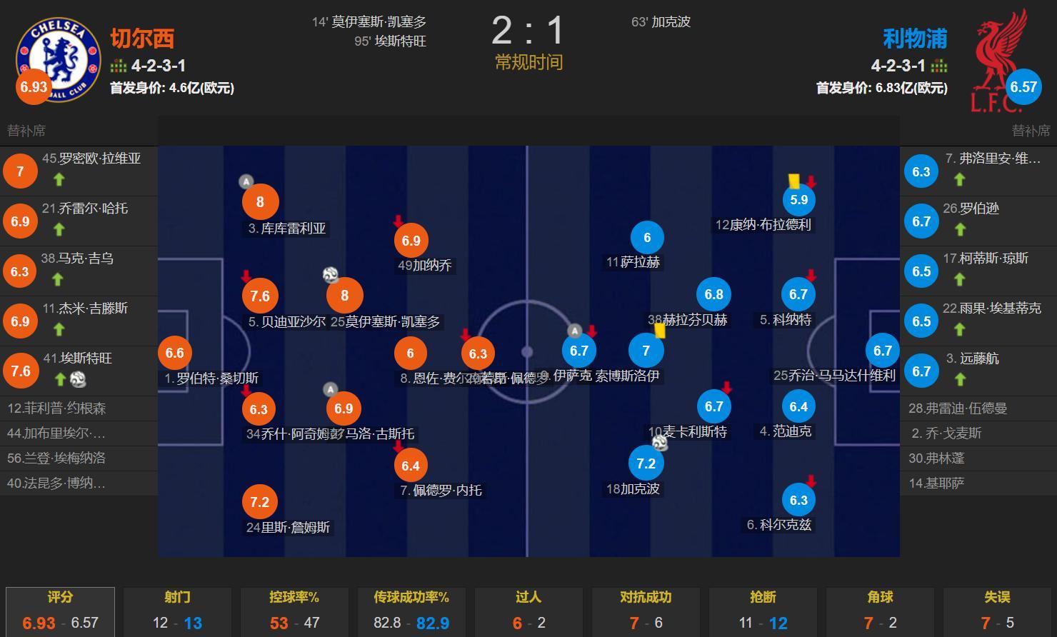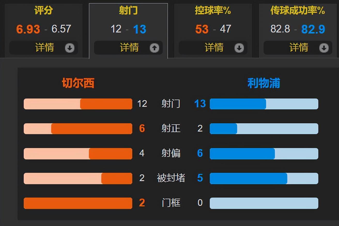 全场比赛,切尔西的控球率为53%,一共有12次射门,其中6次射正;利物浦一共有13次射门,其中仅有2次射正。这场失利,无疑给利物浦的赛季前景蒙上了一层阴影。