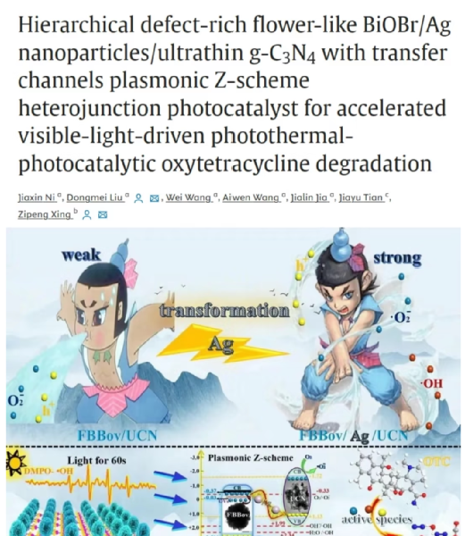 该研究发现通过构建富含缺陷的花状 BiOBr 与 Ag 纳米颗粒和超薄 g-C3N4 组成的等离子体 Z 型异质结,在 60 分钟内实现了 91.7% 的土霉素降解率和 56.2% 的矿化率,且具有优异的可重复使用性和稳定性。作者用葫芦娃的形态变化,展现 Ag 纳米颗粒的作用效果。