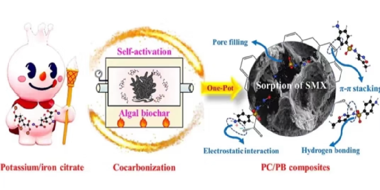 研究通过利用柠檬酸钾/铁(也就是雪王)的自激活作用,从大型藻类中合成了一种新型的多孔碳/多孔生物炭复合材料(PC/PB),并将其用于高效吸附水中的磺胺甲恶唑(SMX)。