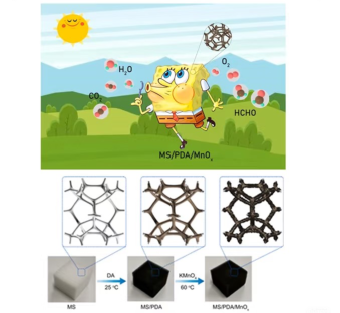 通过其三维多孔结构和光热转换功能,在室温下高效去除 40-320 ppm 浓度的气态甲醛,反应速率显著高于传统催化剂,并提出了可能的光热催化机制。