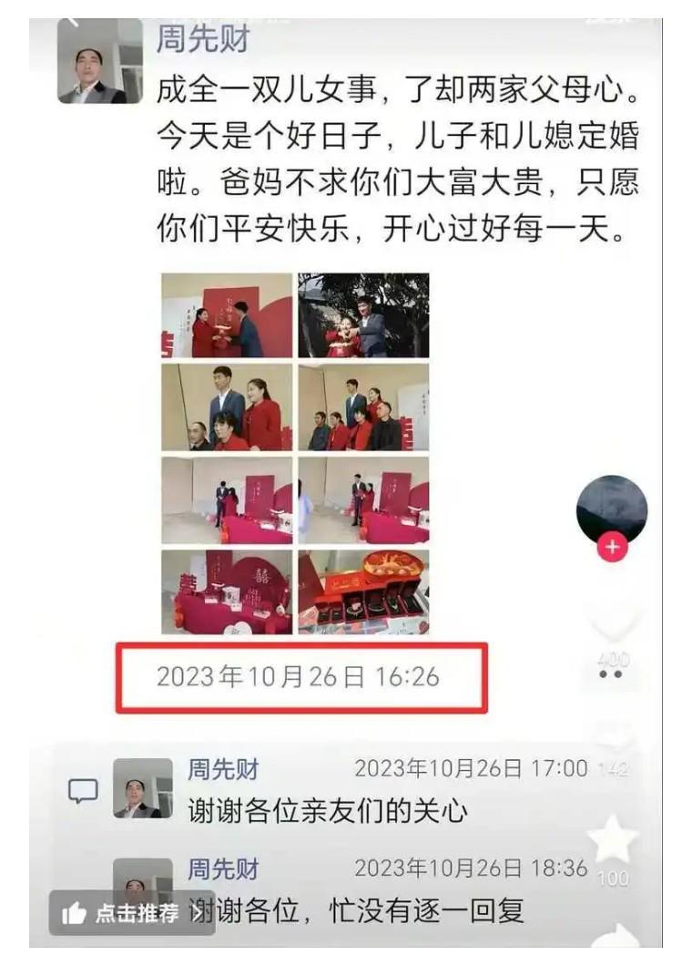 可能他非常重感情,一想到因为不出这个下车礼,两人这个婚姻就得吹了,他承受不了这个后果。在订婚那天,新郎的父亲周先生还特意发布了一个朋友圈,为儿子庆祝。