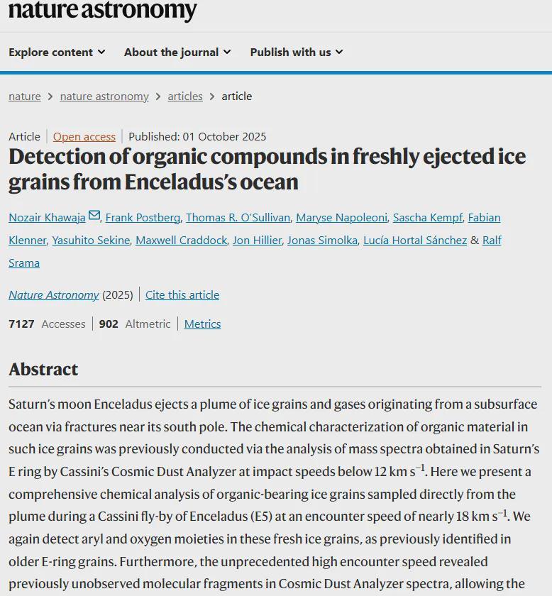 2025年10月1日,这项里程碑式的研究成果发表在国际顶级期刊《自然·天文学》上。它几乎解决了天体生物学界一个长久以来的核心谜题,证明了这颗冰冷卫星的内部拥有一个化学物质极其丰富的“原始汤”,具备了生命起源所需的所有关键要素:液态水、来自海底热液的能量,以及现在被证实的、种类繁多的有机物。
