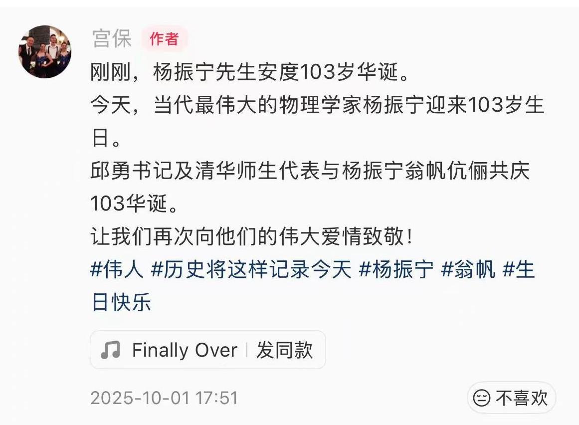 10月1日,是杨振宁103岁的生日,当天,他与妻子翁帆,狠狠秀了一把恩爱。