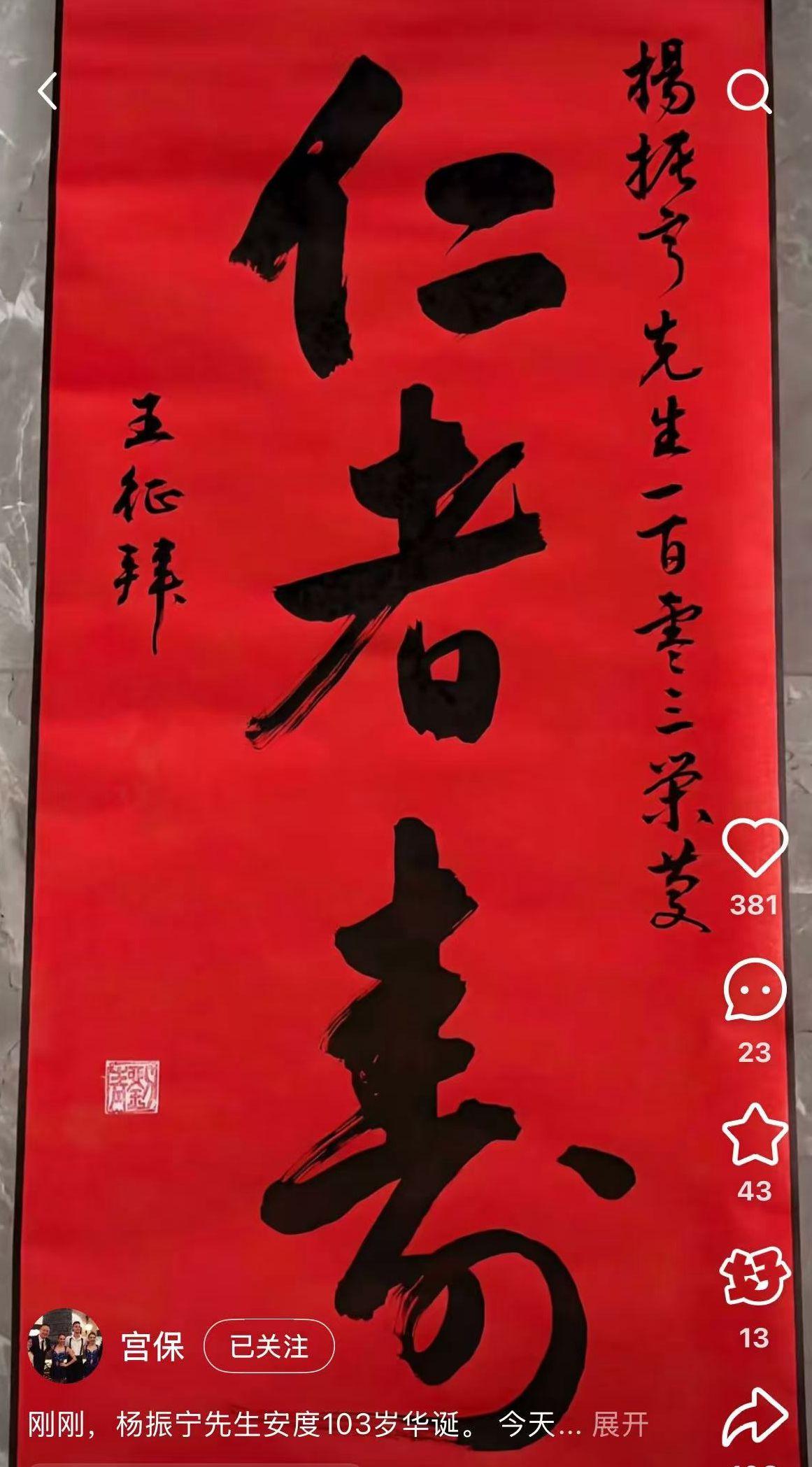巧的是,好友王征当天带的贺礼,是自己写的一幅毛笔字,恭贺杨振宁103岁的华诞。