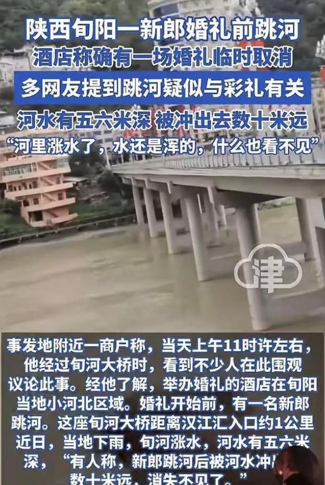 第二天上午,旬阳市融媒体中心发布了通报,称跳河的是吕河镇的周某某,也就是周绪阳,二十九岁,初步查出来是因为婚礼上的一些琐事,情绪没控制住才轻生的。同时,各部门还在继续找人,也在安抚家里人,并提醒大家不要乱传谣言,要理性说话。