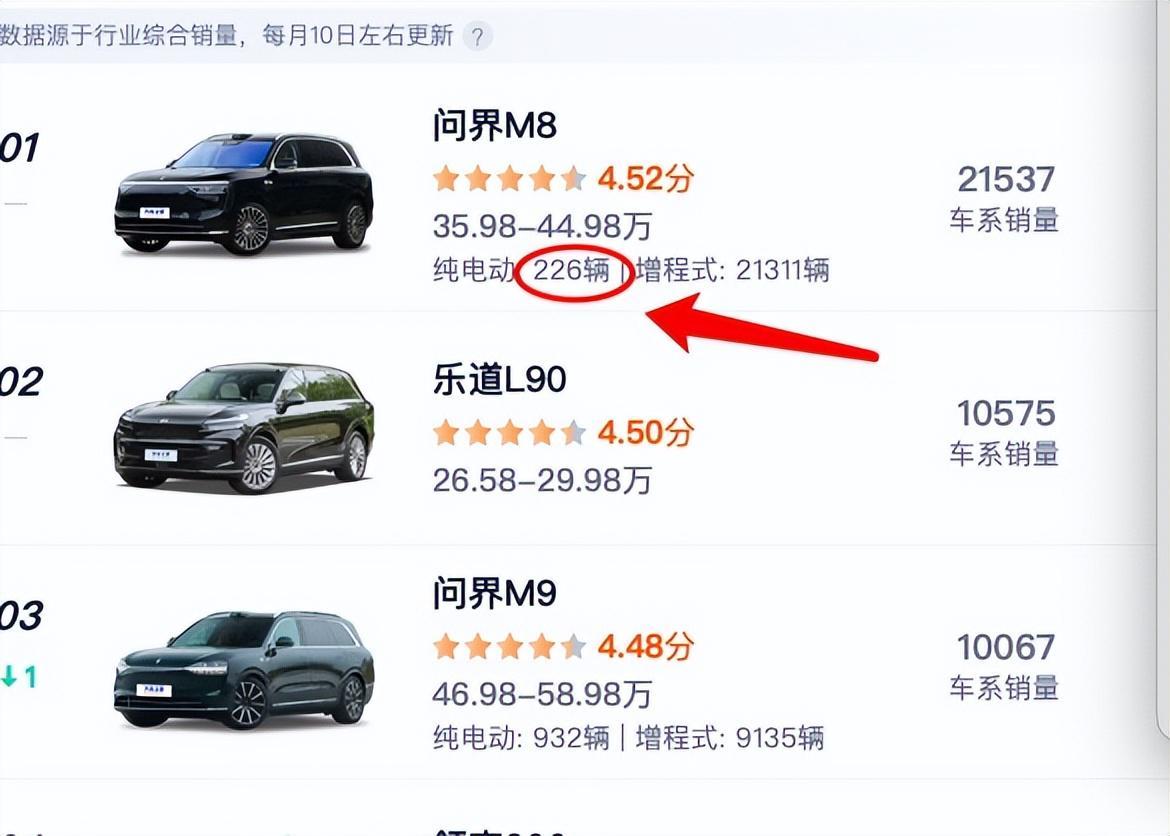 乘联会2025年1-8月数据显示,在30万元以上新能源SUV销量榜TOP 10中,增程式车型占据7席,而插电混动车型仅占2席(且多为MPV)。以问界M8为例,这款既有纯电又有增程结构的车型,8月销量21537辆中,纯电版本仅226辆,占比仅1%。这一数据,直观展现了高端市场对增程式的“偏爱”。