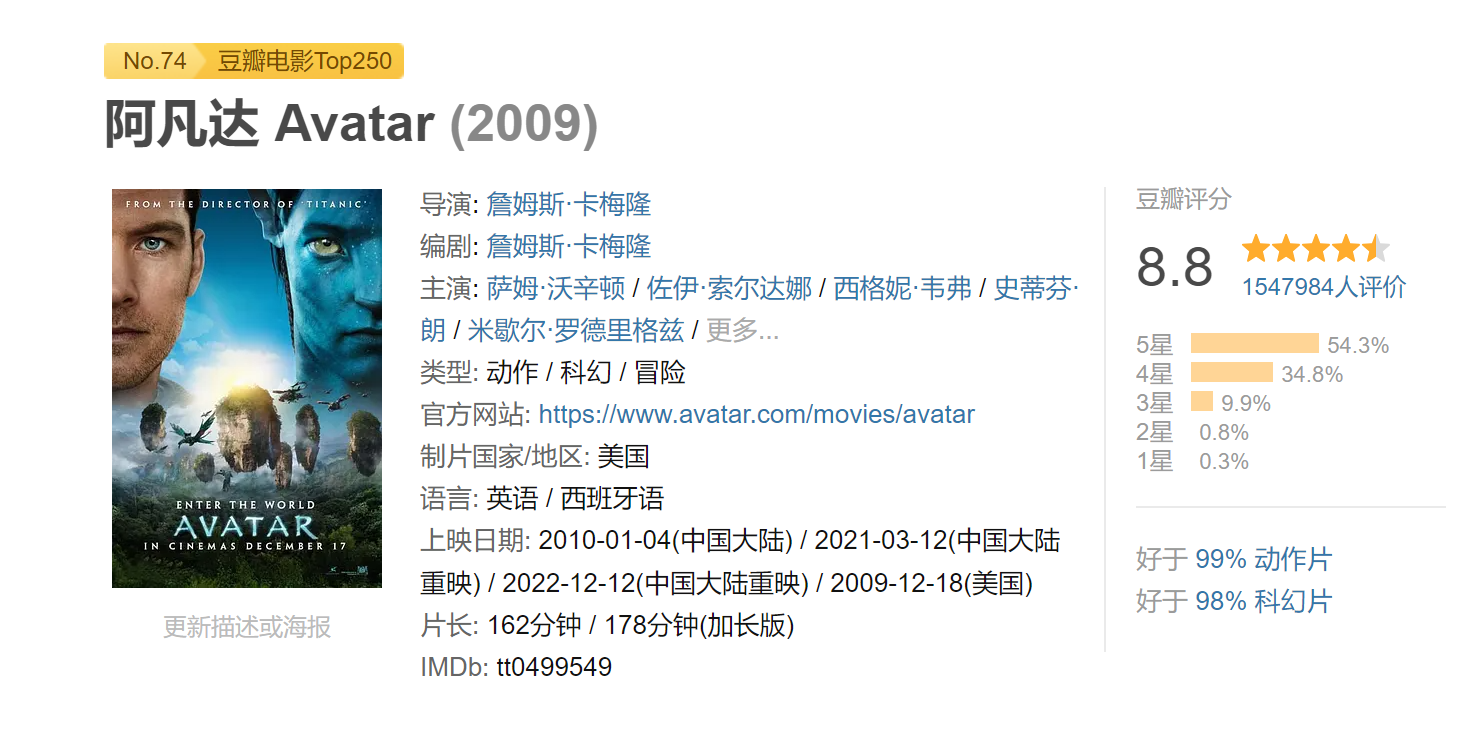 尽管《阿凡达》的故事情节并不算出众,豆瓣评分也仅属于中上水平,但这部电影无疑是全球影史上的一个里程碑。无论是行业内人士、影评人还是普通影迷,都对它趋之若鹜。