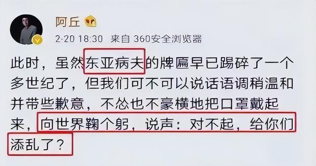 而他却“逆流而上”,发了一条微博,一个“东亚病夫”,一个要求国人向世界鞠躬致歉,令人瞠目结舌。