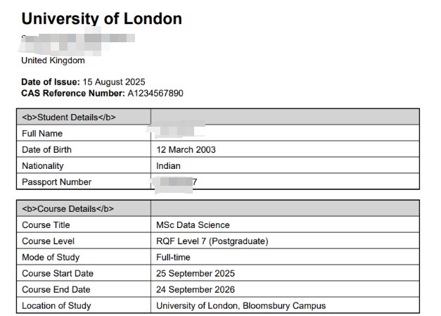 CAS上包含学生的个人信息、课程名称和起止时间、学费金额、已缴费用以及学校的担保资质等。它是证明学生确实获得了合法合规的录取资格的重要文件,英国移民局会依此判断学生是否符合学生签证的申请条件。