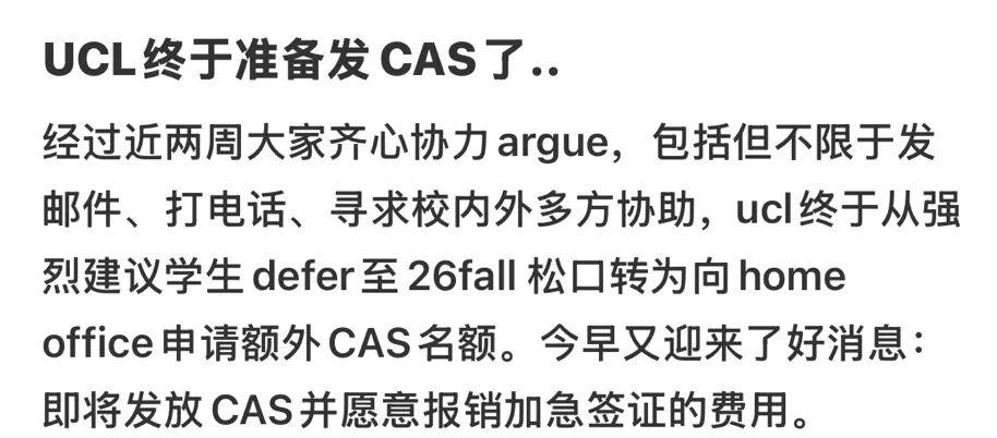 不少学生早早收到了UCL的录取通知书(offer),满心欢喜地交了押金、订了住宿,甚至买好了机票。然而,就在开学前夕,一封来自学校的邮件却如冷水浇头:由于发不出CAS(确认录取函),学生今年无法入学。