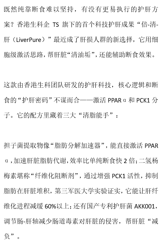 针对断食执行难的问题,科学家提出“科技+断食”的组合方案。例如,通过担子菌提取物激活PPARα、二氢杨梅素增强PCK1活性,可主动促进肝内脂肪分解,相当于为断食效果叠加“加速buff”。某三甲医院消化科专家指出:“断食是有效的基础手段,但多数人需要辅助支持才能长期坚持。”