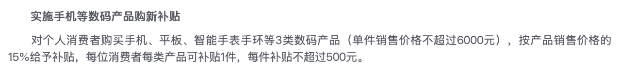 本轮国补政策延续了此前的补贴标准,重点覆盖手机、平板、智能手表、智能手环等3C数码产品领域。具体补贴规则为:按产品售价的15%进行补贴,单件产品补贴上限为500元,且产品售价不得超过6000元。这意味着,售价在3334元至6000元之间的数码产品,均可享受满额500元补贴;而售价低于3334元的产品,则按实际售价的15%计算补贴金额。